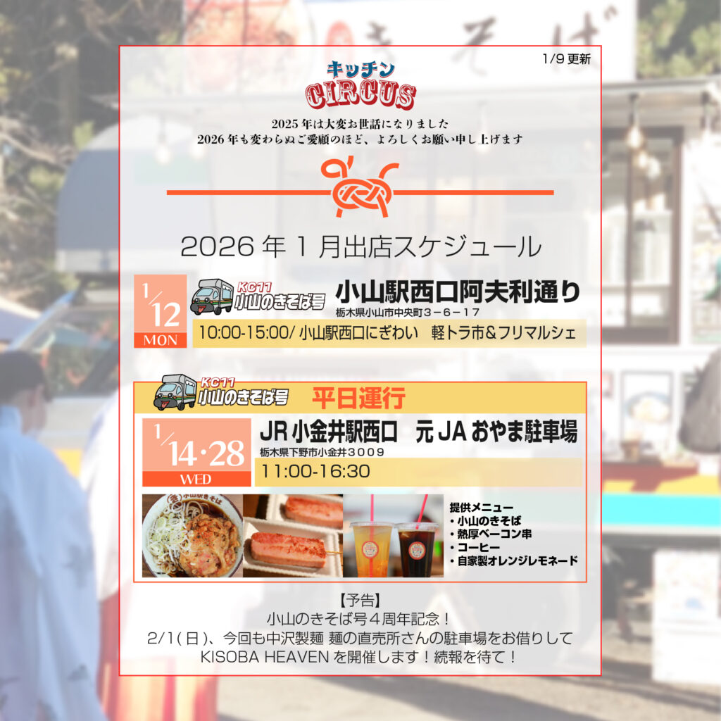 新年あけましておめでとうございます。 旧年中は「キッチンCIRCUS」小山のきそば号・喫茶33・吉田屋をご愛顧いただき、誠にありがとうございました。